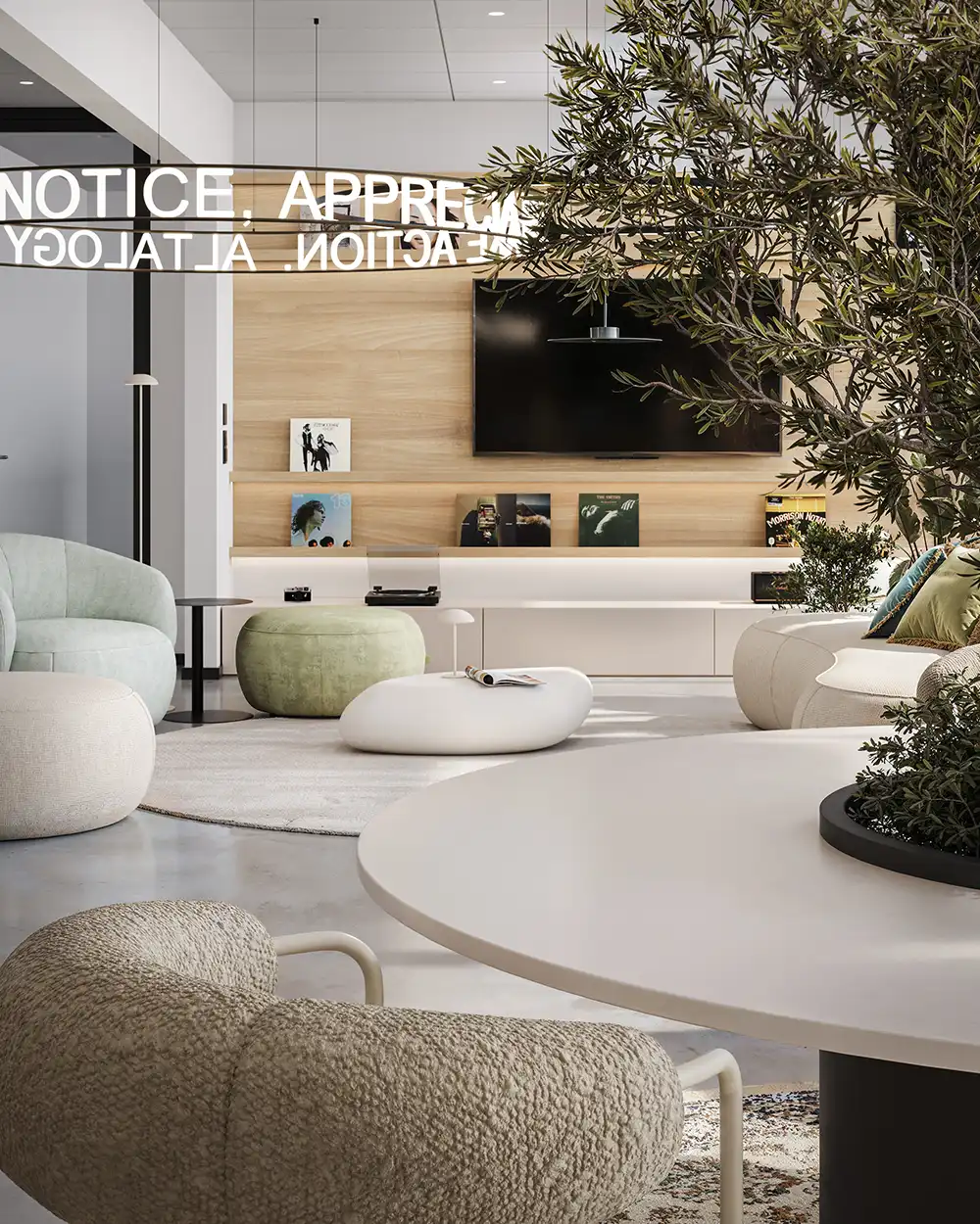 Klient potrzebował miejsca, które będzie jednocześnie funkcjonalne i inspirujące – przestrzeni do pracy, spotkań i chwil oddechu w ciągu dnia. Zamiast sztywnego układu, postawiliśmy na otwartą, elastyczną strefę z miękkimi meblami, naturalnymi materiałami i dużą ilością światła. Zielenie i beże wprowadzają spokój, a okrągłe formy nadają wnętrzu przyjazny, nieformalny charakter. Charakterystyczny świetlny ring z hasłem motywacyjnym podkreśla tożsamość marki i dodaje energii całej przestrzeni.